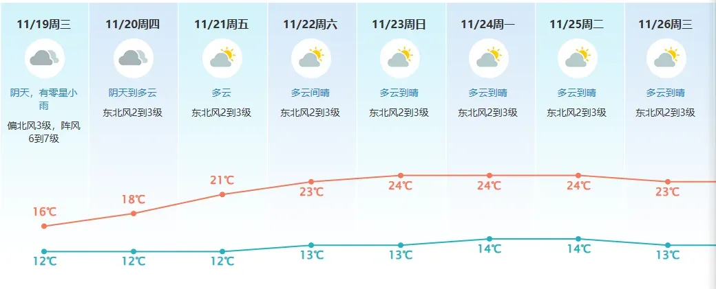 省气象台预计,18日—19日,广东大部分市县阴天,各地气温将较17日明显下降,过程气温下降幅度:粤北市县下降8~10℃,中南部市县下降6~8℃。