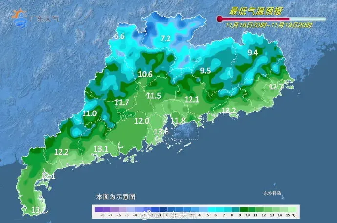 另外,此次降温过程中大部分市县的最低温将出现在20日早晨前后,届时粤北偏北市县最低温或将低至5~8℃(粤北高海拔山区2~5℃)。