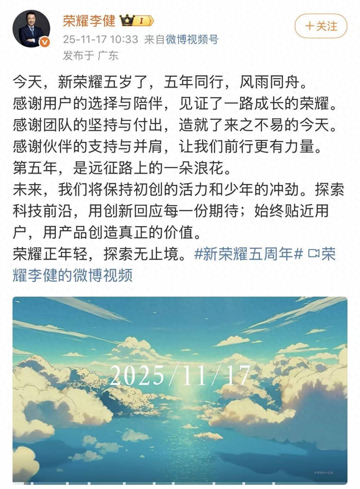 最安全的线上配资平台 新荣耀5周年,CEO李健发文:感谢用户、团队与伙伴 荣耀 来源:元鼎证券开户 网站:元鼎证券_元鼎证券官网登录入口--专业配资服务,操作便捷! 查看:94 日期:2025-11-18 04:31:44