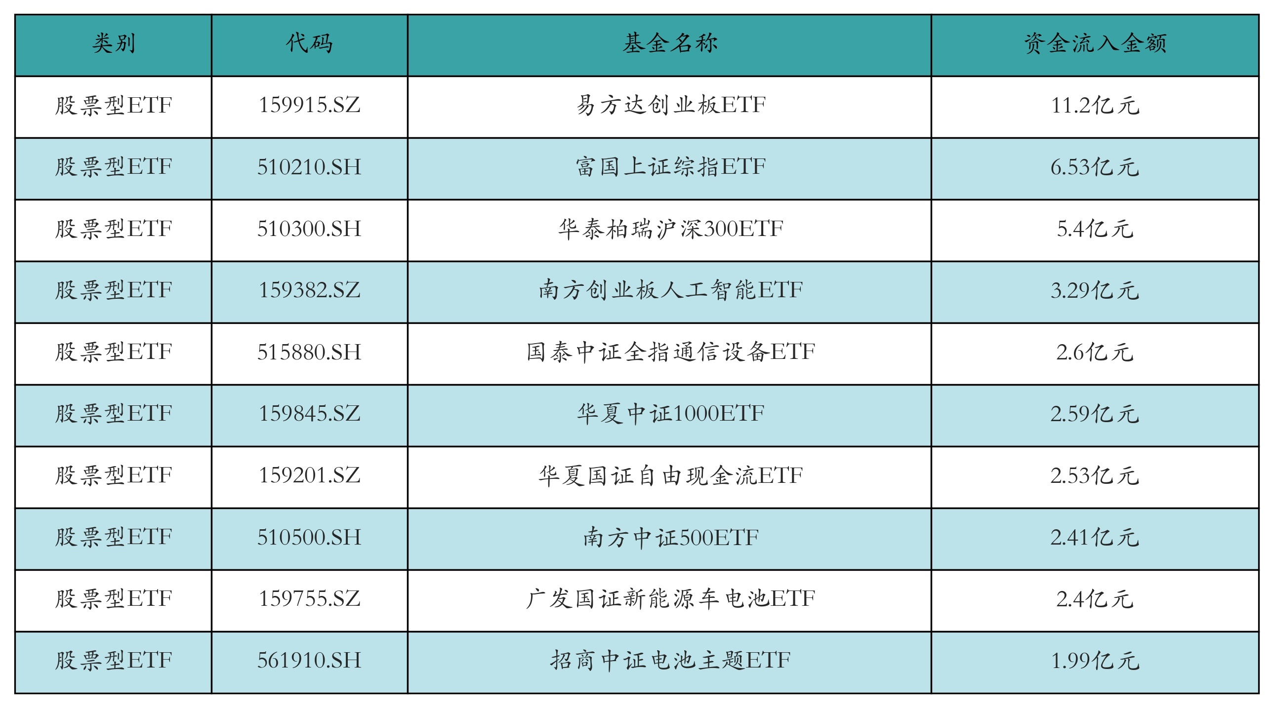 昨日股票型ETF资金流入最多的3只ETF及其流入金额分别为:易方达创业板ETF(流入11.2亿元)、富国上证综指ETF(流入6.53亿元)、华泰柏瑞沪深300ETF(流入5.4亿元)。资金流入前10详情见下表: