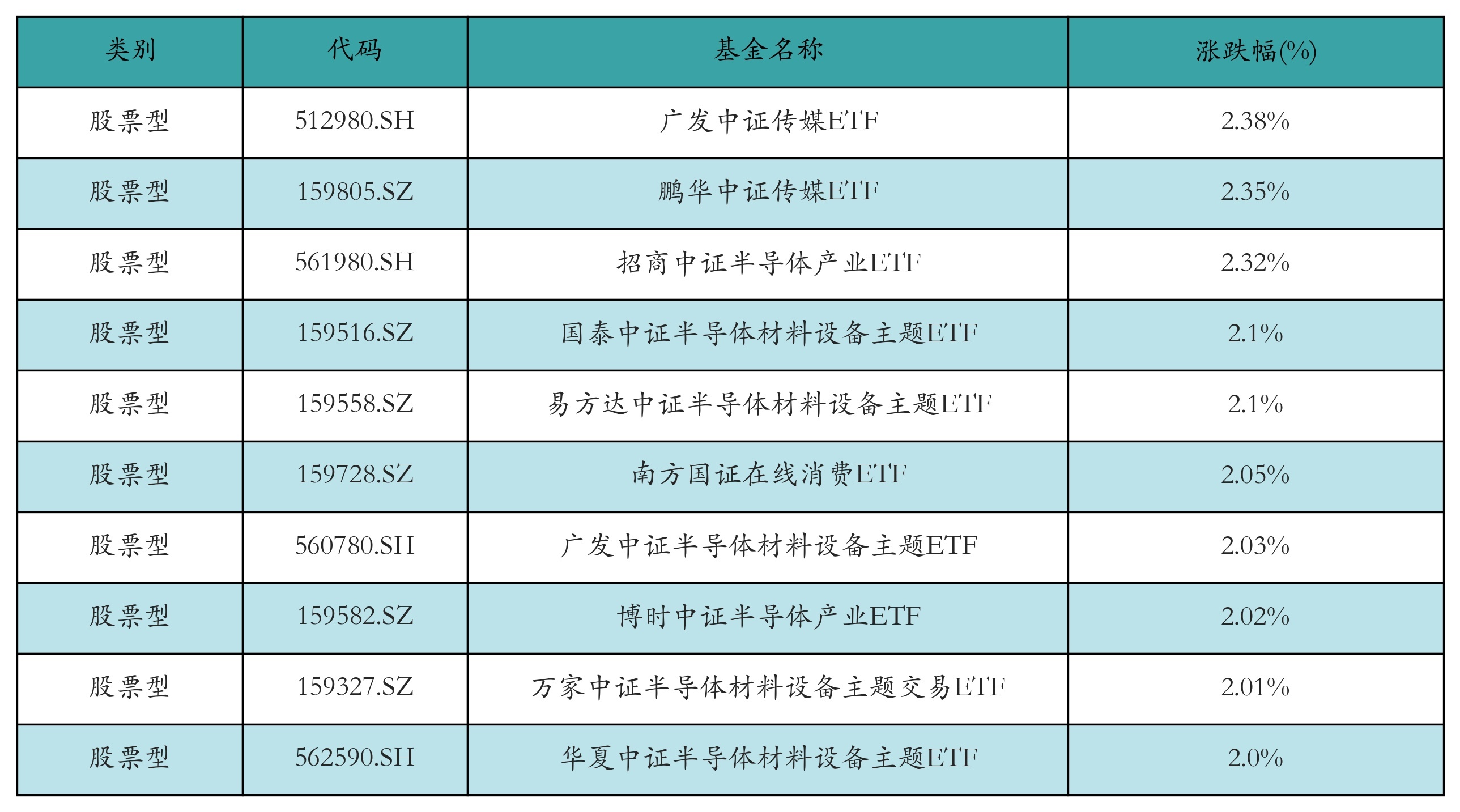昨日股票型ETF涨幅最高的3只ETF及其收益率分别为:广发中证传媒ETF(2.38%)、鹏华中证传媒ETF(2.35%)、招商中证半导体产业ETF(2.32%)。涨幅前10详情见下表: