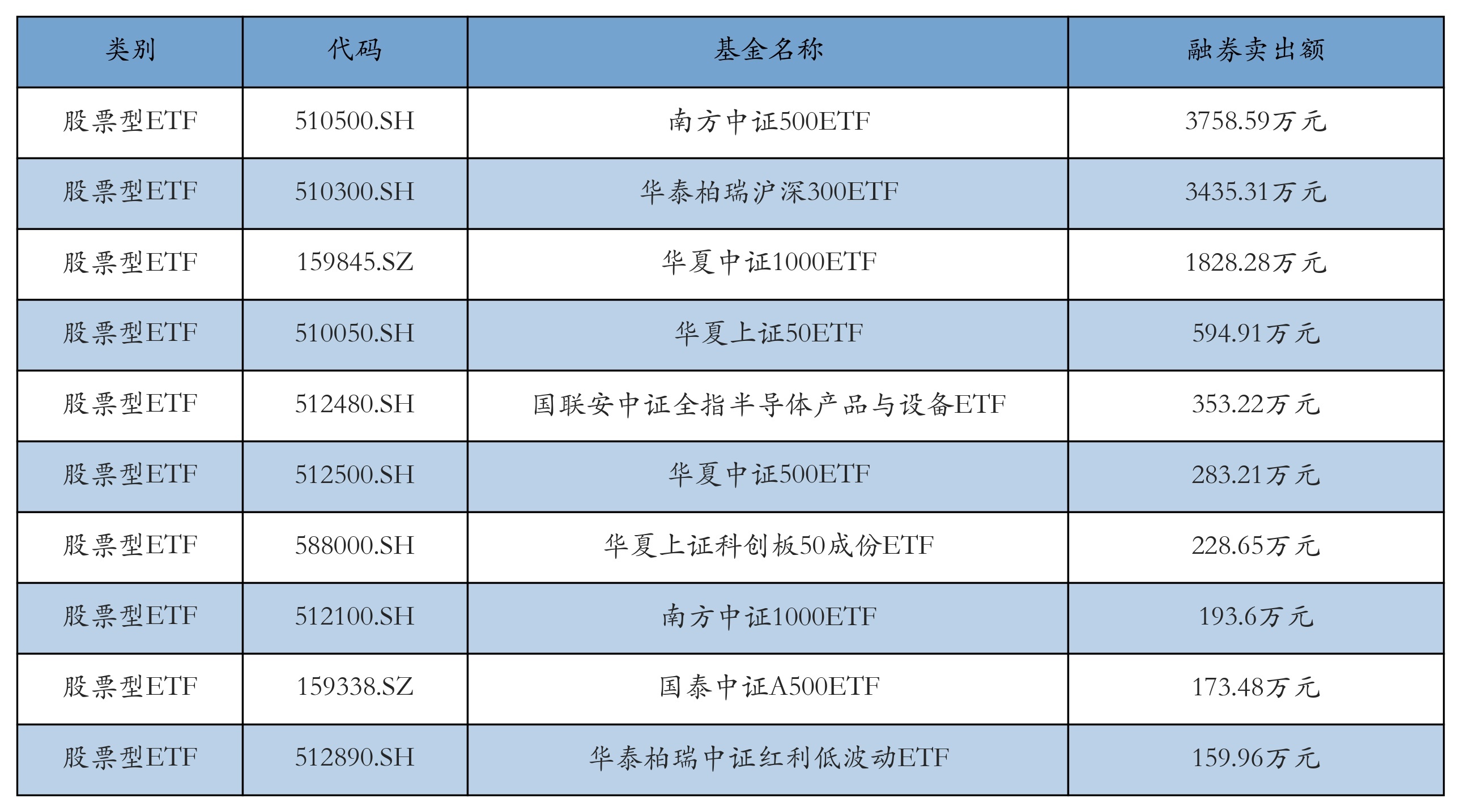 昨日股票型ETF融资卖出额最高的3只ETF及其卖出金额分别为:南方中证500ETF(3758.59万元)、华泰柏瑞沪深300ETF(3435.31万元)、华夏中证1000ETF(1828.28万元)。融券卖出额前10详情见下表: