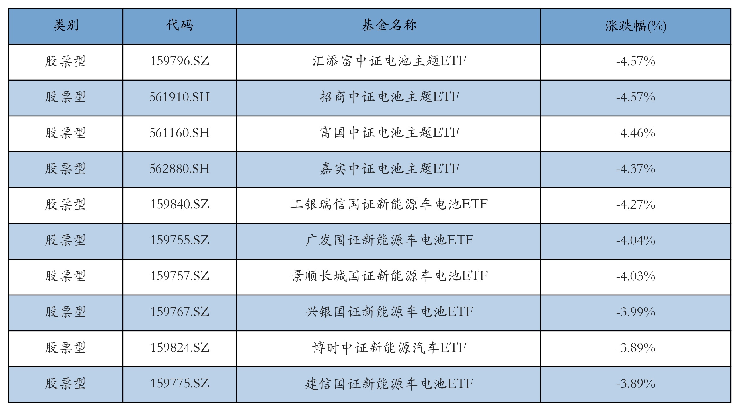 昨日股票型ETF跌幅最大的3只ETF及其收益率分别为:汇添富中证电池主题ETF(-4.57%)、招商中证电池主题ETF(-4.57%)、富国中证电池主题ETF(-4.46%)。跌幅前10详情见下表: