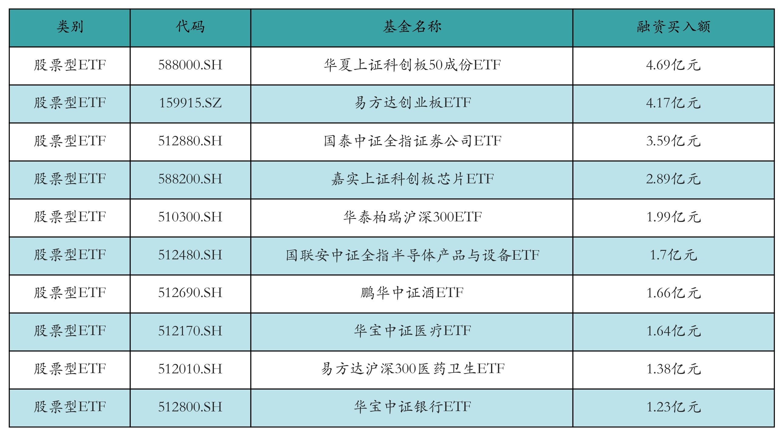 昨日股票型ETF融资买入额最高的3只ETF及其买入金额分别为:华夏上证科创板50成份ETF(4.69亿元)、易方达创业板ETF(4.17亿元)、国泰中证全指证券公司ETF(3.59亿元)。融资买入额前10详情见下表:
