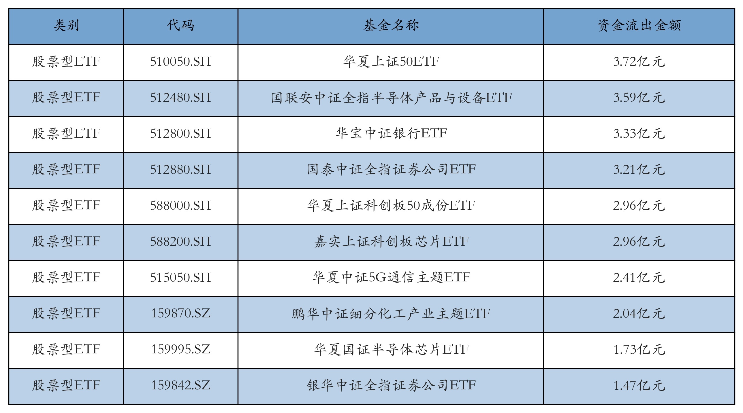 昨日股票型ETF资金流出最多的3只ETF及其流出金额分别为:华夏上证50ETF(流出3.72亿元)、国联安中证全指半导体产品与设备ETF(流出3.59亿元)、华宝中证银行ETF(流出3.33亿元)。资金流出前10详情见下表: